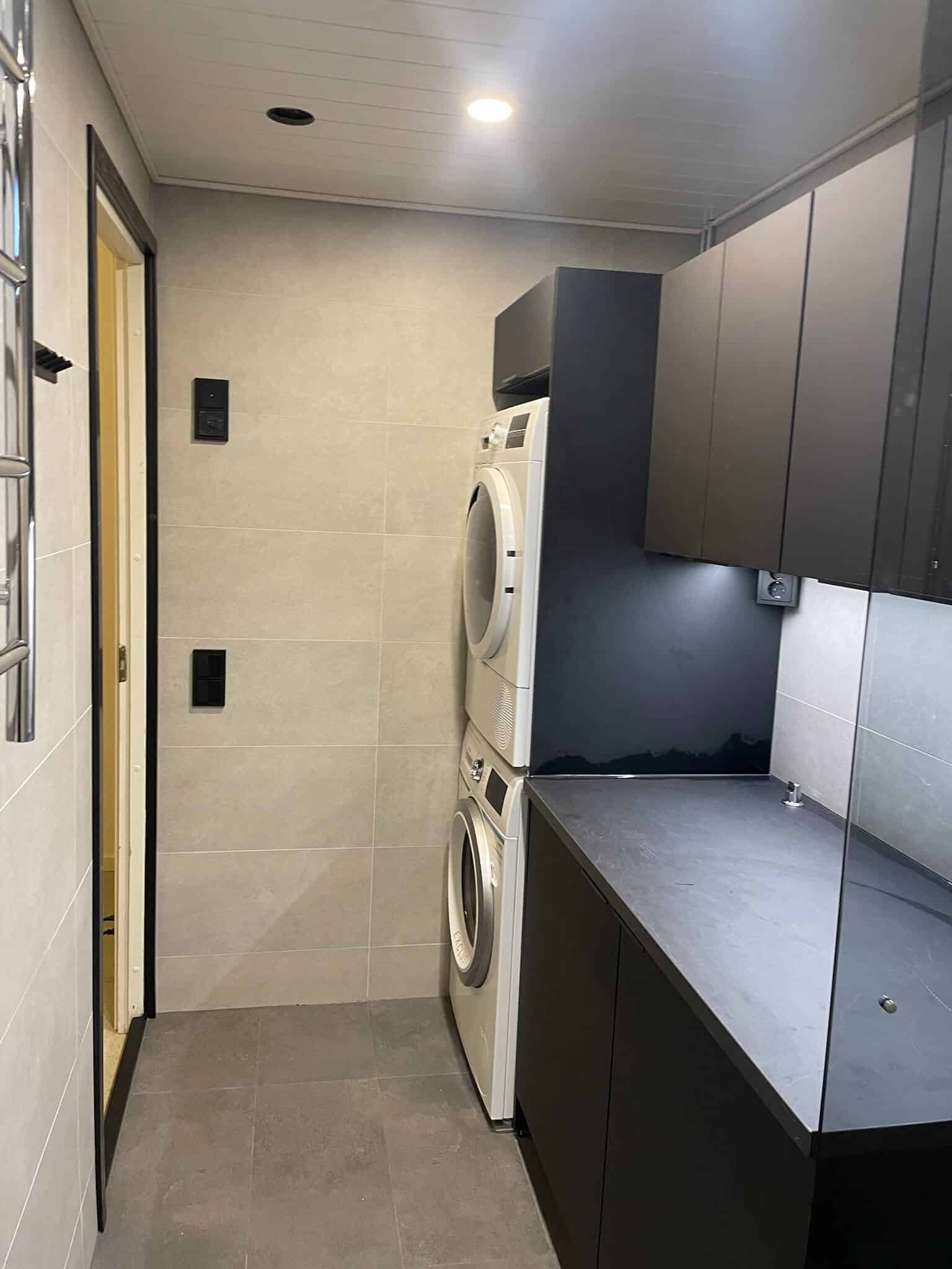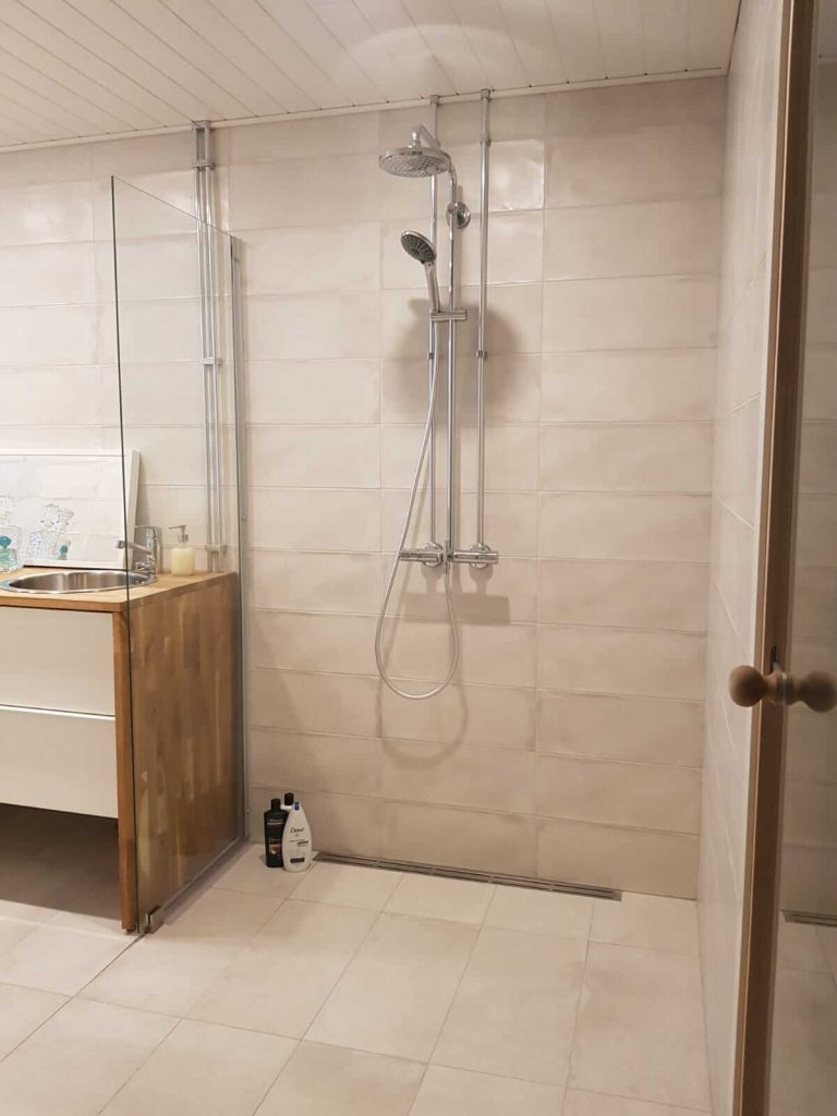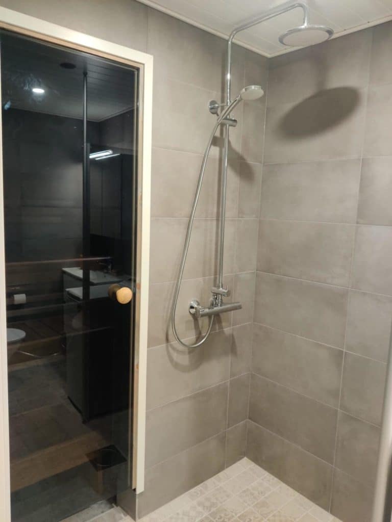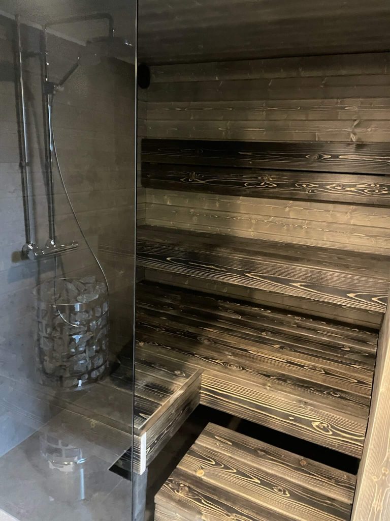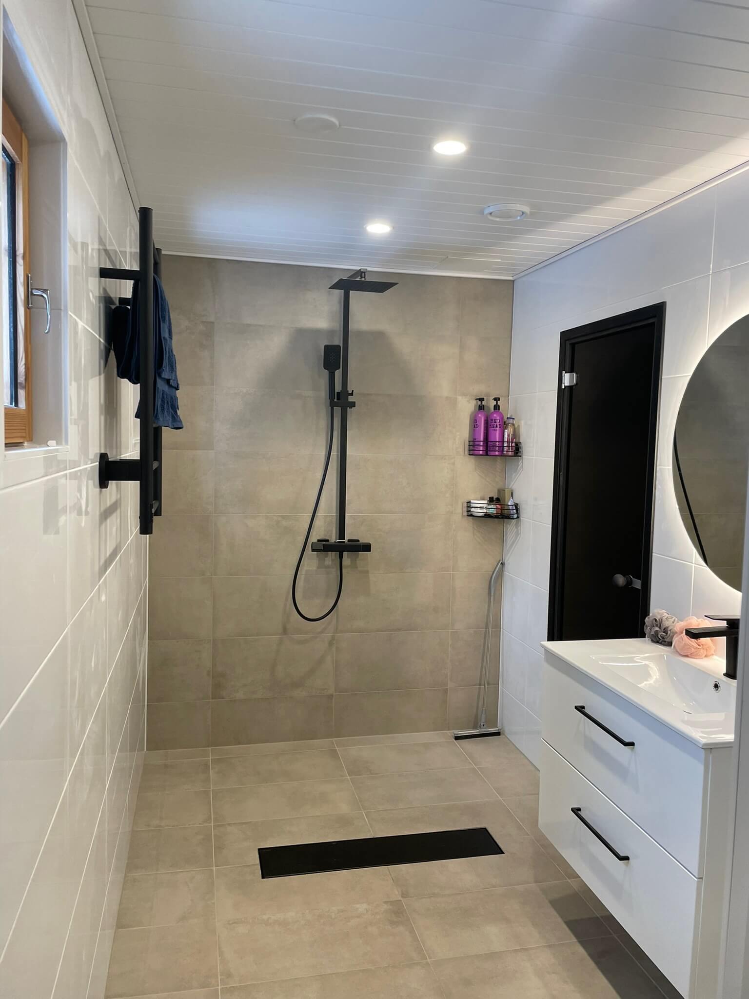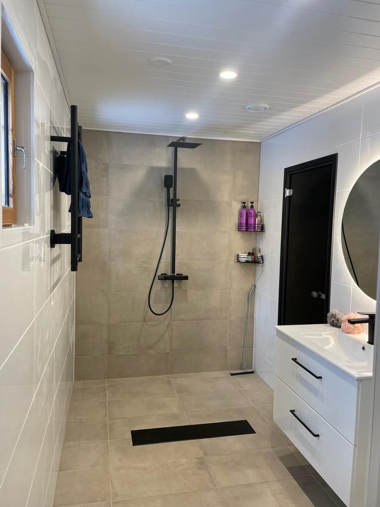 📝 Kuvaus: Teimme kylpyhuoneesta modernin ja sauna toteutettiin asiakaan toiveiden mukaisesti niin että sinne jäi puu sekä sähkökiuas